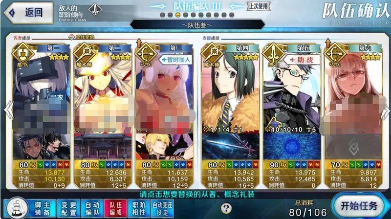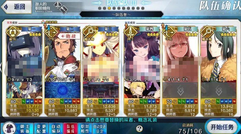 这套阵容的关键在于尽快让天之衣NP充满,但幅度并不大。由于有协助作战机制,只能使用关卡提供的拿破仑。避免翻车。